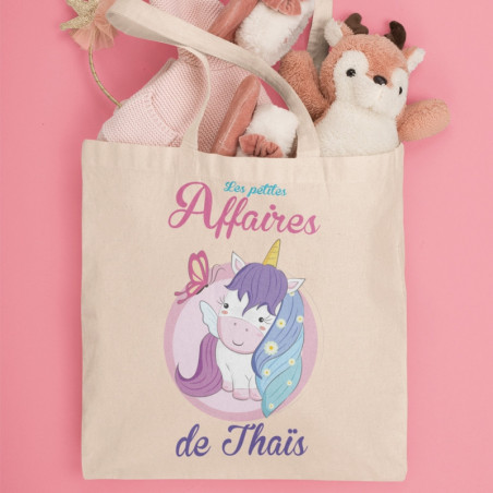 Offrez à votre enfant ou à celui d'un proche ce tote bag enfant personnalisé avec motif licorne. C'est le cadeau idéal pour les anniversaires, la rentrée scolaire ou toute occasion spéciale. Avec l'inscription "Les petites affaires de [Prénom]", ce sac deviendra vite un compagnon indispensable pour chaque sortie.