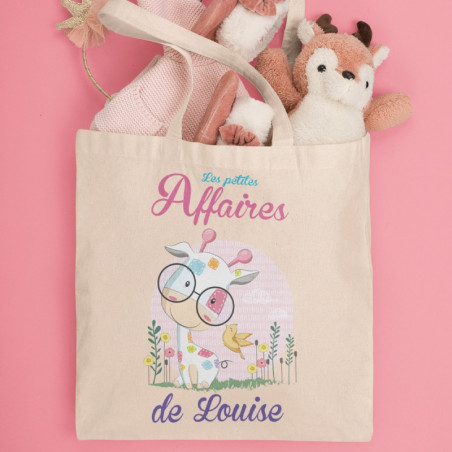 Ce tote bag enfant personnalisé avec motif vache est le cadeau parfait pour les anniversaires, les rentrées scolaires ou toute autre occasion spéciale. Avec l'inscription "Les petites affaires de [Prénom]", il devient un accessoire indispensable et pratique pour les enfants.