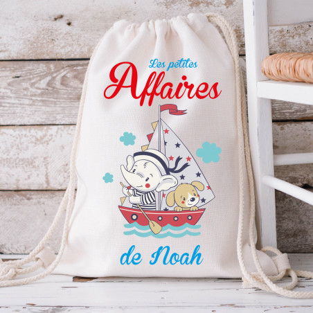 🎒Ce sac à dos unique, portant le texte "Les petites affaires de Noah" et un adorable motif marin avec un éléphant et un chien sur un bateau, est conçu pour rendre chaque jour d'école spécial et inoubliable.