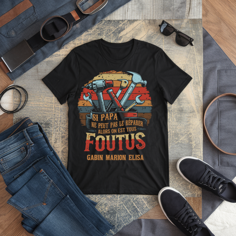 🔧 Le t-shirt personnalisé parfait pour les papas bricoleurs (ou presque) Vous avez un papa touche-à-tout, toujours prêt à sortir la caisse à outils ? Ce t-shirt personnalisé papa avec l’inscription “Si Papa ne peut pas le réparer, personne ne peut” est fait pour lui. À la fois drôle et tendre, il valorise toutes ses tentatives de réparation, même les plus improbables. Et avec les prénoms de ses enfants, c’est le genre de cadeau qu’il n’oubliera jamais.