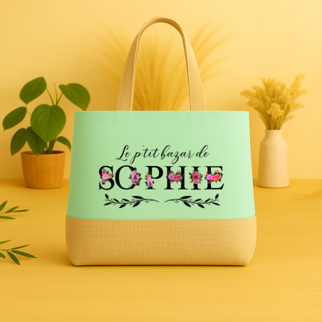 Faites plaisir avec ce sac cabas personnalisé “Le p’tit bazar de [prénom]” 🌸 ! Pratique, coloré et élégant, il accompagnera son heureuse propriétaire partout : au travail, en week-end ou pour le shopping. Un cadeau idéal pour une femme, une maman, une amie ou une collègue, parfait pour Noël, un anniversaire ou la fête des mères.