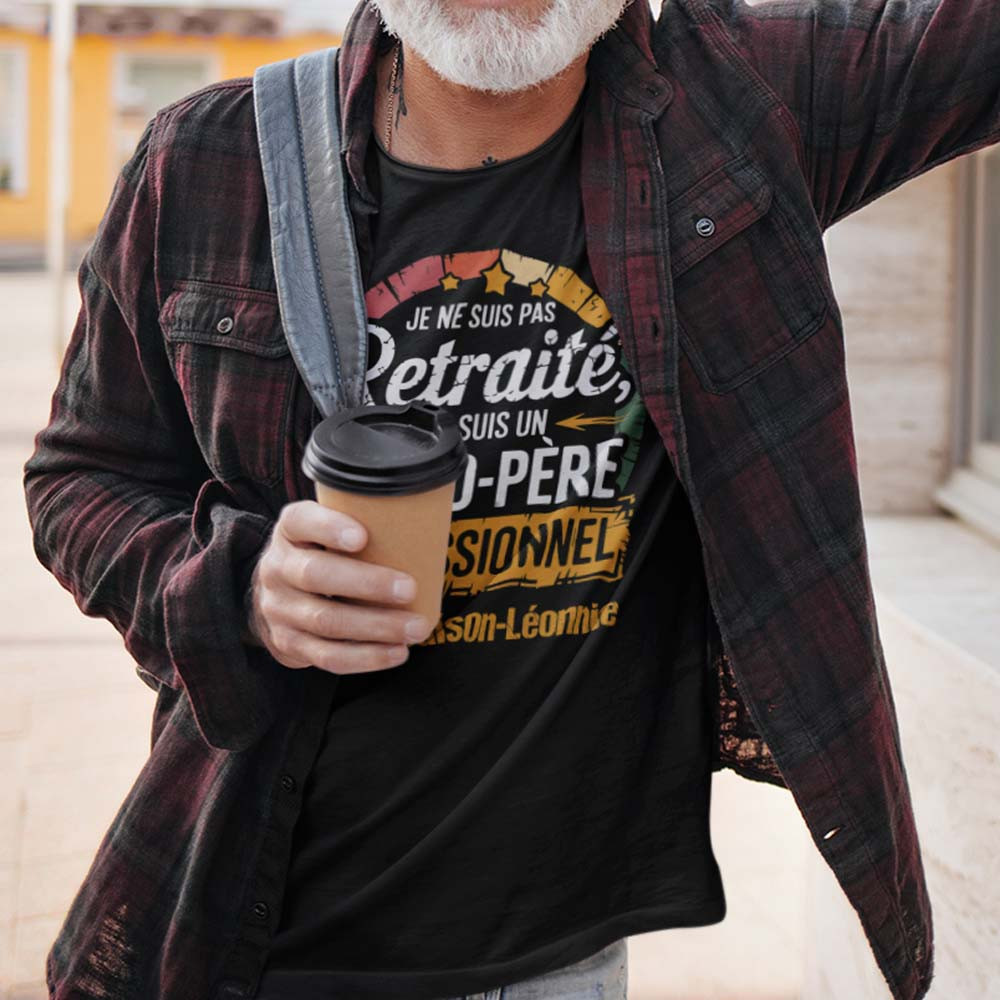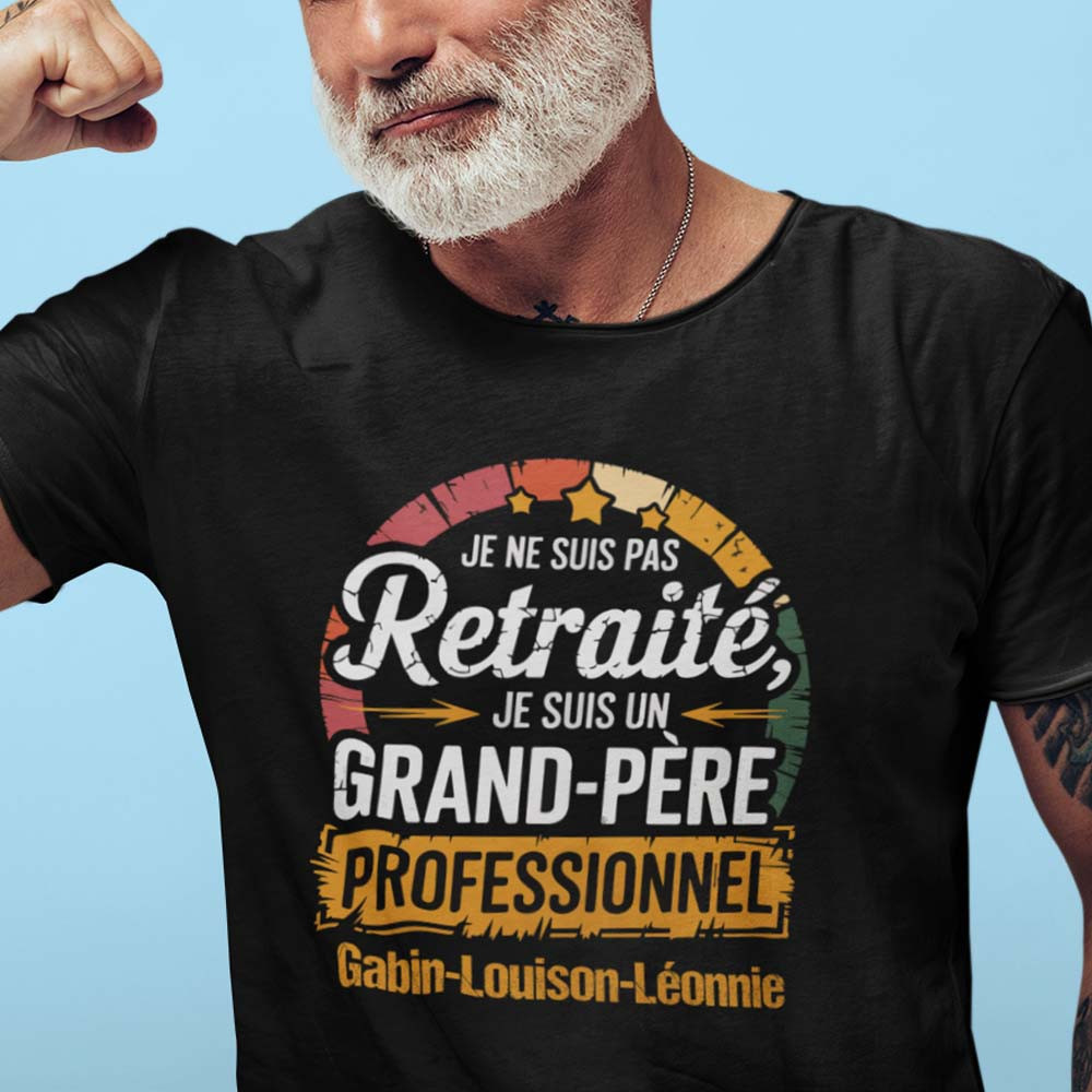 Ce t-shirt papy personnalisé est le cadeau idéal pour un grand-père qui sait rire de lui-même et apprécier son rôle dans la famille. L’inscription “Je ne suis pas retraité, je suis un grand-père professionnel” est à la fois amusante et valorisante, mettant en avant l’importance de ce rôle si cher. Personnalisez-le avec les prénoms de ses petits-enfants pour en faire un cadeau grand-père unique et touchant qu'il pourra fièrement afficher lors de ses sorties ou réunions de famille.