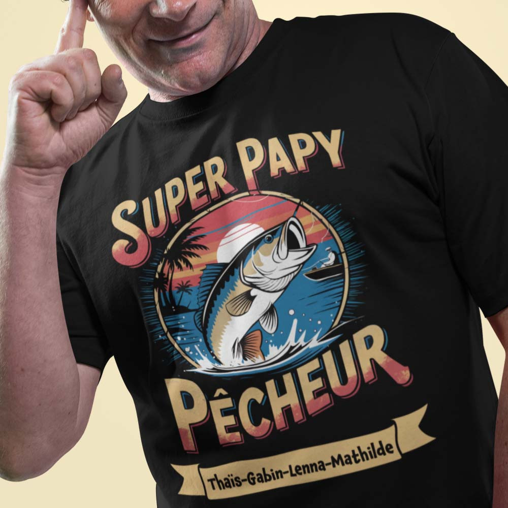 T-shirt Papy Personnalisé – "Super Papy Pêcheur" avec Prénoms des Petits-Enfants
